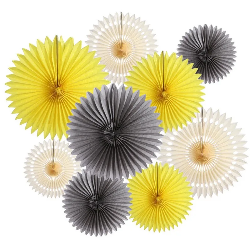 9 pcs Yellow Grey Ivory Baby Shower Tissue Paper Fans Decoration Hanging Vintage Style Wedding Part