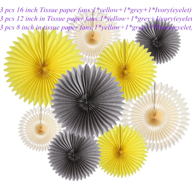 BEST QUALITY 9 pcs Yellow Grey Ivory Baby Shower Tissue Paper Fans Decoration Hanging Vintage Style Wedding Part